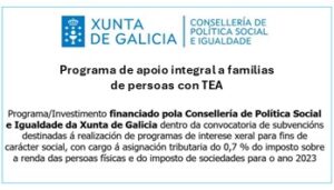 A Consellería de Política Social e Xuventude da Xunta de Galicia través da “Asignación tributaria do 0,7 % do IRPF” concedeu á nosa entidade na convocatoria do ano 2023,  unha aportación económica para a execución do Programa de apoio integral a familias de persoas con TEA. Esta axuda é fundamental para o desenvolvemento e continuidade de dito programa.